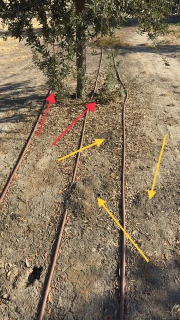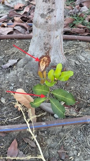 Shoots from roots means roots have been injured (Red arrows). Burrowing rodents (yellow arrows) eat tree roots and cause roots near the soil surface to sprout.